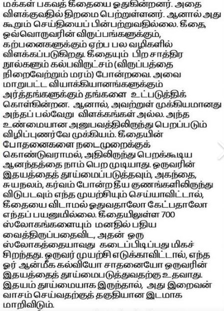 Menschen rezitieren die Bhagavad Gita, erreichen Kompetenz darin sie zu erklären, aber leben nicht nach der Nachricht. Die Gita wird auf viele Arten gemäß den Launen und Vorstellungen jedes Einzelnen interpretiert. Die Gita und andere biblische Texte sind wie der Kalpavriksha (der wunscherfüllende Baum). Sie eignen sich für unterschiedliche Interpretationen und Bedeutungen. Entscheidend ist jedoch nicht die vielfältige Interpretation, sondern das aus der tatsächlichen Erfahrung abgeleitete Verständnis. Ohne die Lehren der Gita in die Praxis umzusetzen, können wir nicht die Glückseligkeit ableiten, die daraus entstehen kann. Das endlose Rezitieren oder Hören der Gita nützt nichts, wenn nichts unternommen wird, um das Herz zu reinigen und schlechte Eigenschaften wie Ego, Egoismus und Stolz loszuwerden. Es ist besser, eine einzelne Strophe der Gita in die Praxis umzusetzen, als alle 700 Verse auswendig zu lernen. Kein spirituelles Studium oder Sadhana kann helfen, das Herz zu reinigen, wenn man sich nicht anstrengt. Und wenn das Herz gereinigt ist, wird es ein würdiger Aufenthaltsort für das Göttliche.
