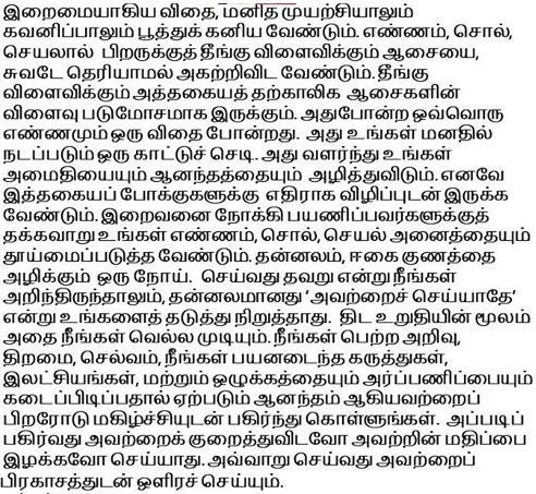 दिव्यता के बीज को मानव प्रयास और फूलने और फलने-फूलने के लिए स्थिर देखभाल द्वारा विकसित किया जाना चाहिए। विचार, शब्द और कर्म में दूसरों को नुकसान पहुंचाने की इच्छा के सभी लक्षणों को अपने दिमाग से निकालें। नुकसान पहुंचाने के लिए ऐसे अस्थायी रूप से संतोषजनक व्यवहार में लिप्त होने का परिणाम विनाशकारी है। ऐसा प्रत्येक विचार एक बीज है, एक जंगली खरपतवार है जो आपके मन में लगाया जाता है। यह आपकी अपनी शांति और आनंद को बढ़ाएगा और नष्ट करेगा। तो, ऐसी प्रवृत्तियों के खिलाफ सतर्क रहें। दिव्य की ओर अग्रसर होने के लिए अपने विचारों, शब्दों और कर्मों को साफ़ करें। स्वार्थ ही वह नासूर है जो दान को नष्ट कर देता है। यद्यपि आप जानते हैं कि यह गलत है, स्वार्थ आपको निराश नहीं होने देगा। आप इसे स्थिर निर्धारण के माध्यम से दूर कर सकते हैं। खुशी-खुशी दूसरों को आपके द्वारा अर्जित ज्ञान, कौशल और धन, विचारों और आदर्शों से लाभान्वित करें, और अनुशासन और समर्पण का अभ्यास करें। साझा करना उन्हें कम नहीं करेगा या उन्हें अवमूल्यन नहीं करेगा, बल्कि उन्हें जोड़े हुए चमक के साथ चमका देगा।