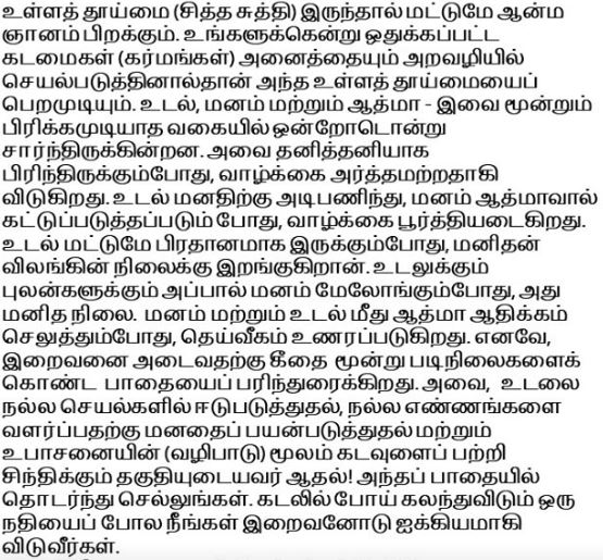 Wiedza o prawdziwej jaźni (atmadżniana) zajaśnieje tylko wówczas, gdy zdobędziesz czystość serca (czitta śuddhi). Osiągniesz ją jedynie wtedy, gdy będziesz w prawy sposób wypełniał wszystkie wyznaczone ci obowiązki (karmy). Ciało, umysł i atma są nierozerwalnie związane. Jeśli są rozdzielone, życie traci znaczenie. Jeśli ciało podlega umysłowi, a nad umysłem panuje atma, życie znajduje spełnienie. Jeśli panuje wyłącznie ciało, człowiek zniża się do poziomu zwierzęcia. Gdy umysł panuje nad ciałem i zmysłami, osiąga się poziom ludzki. Gdy atma panuje nad umysłem i ciałem, urzeczywistnia się boskość. Dlatego Gita zaleca trzystopniową drogę do boskości: angażowanie ciała w dobre czyny, wykorzystywanie umysłu do rozwijania dobrych myśli i kontemplowanie Boga przez upasanę (oddawanie czci)! Podążaj tą drogą, a osiągniesz etap, na którym połączysz się z Bogiem, tak jak rzeka łączy się z oceanem.