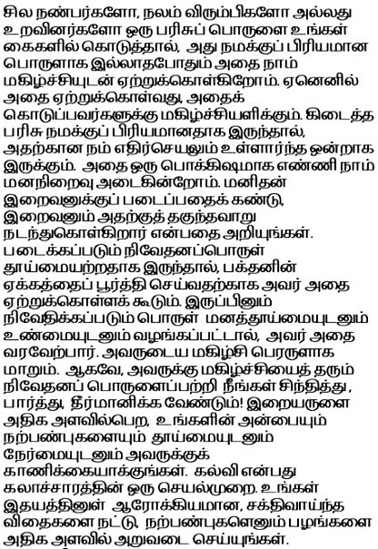 Ketika beberapa teman, sahabat atau kerabat menaruh sebuah hadiah di tangan kita, kita menerimanya dengan senang hati, walaupun hadiah itu tidak menyenangkan kita, karena penerimaan kita dapat menyenangkan mereka. Ketika hadiah itu menyenangkan kita, reaksi kita menjadi sepenuh hati. Kita menghargainya dan diliputi oleh perasaan itu. Ketahuilah bahwa Tuhan juga memberikan reaksi yang sama terhadap apa yang dipersembahkan manusia kepada-Nya. Jika persembahan itu tercemar, Tuhan mungkin menerimanya untuk memuaskan keinginan bhakta. Namun ketika persembahan itu menyenangkan Tuhan dalam kesucian dan ketulusan, Tuhan menerimanya dan suka cita Tuhan diterjemahkan dalam rahmat yang berlimpah. Jadi engkau harus memeriksa ke dalam diri, menemukan dan memutuskan pada persembahan yang membuat Tuhan menjadi senang! Persembahkan Tuhan cinta kasih dan sifat-sifat baikmu, dengan kesucian dan ketulusan untuk menerima rahmat dan karunia-Nya yang melimpah. Pendidikan adalah sebuah proses kebudayaan. Taburlah benih yang sehat dan bagus di ladang hatimu dan panenlah buah yang sangat berguna yaitu sifat-sifat baik.