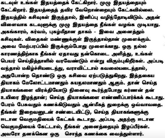 Tuhan meminta hati, hati yang seutuhnya dan tiada lain hanyalah hati. Jika hati memiliki banyak kebocoran maka sifat manisnya akan hanyut dan engkau tidak bisa mempersembahkannya kepada Tuhan lagi. Sifat egois, kesombongan, rasa haus akan ketenaran – semuanya ini adalah kebocoran yang ada. Benih hanya akan tumbuh ketika benih itu tertanam dengan baik di dalam tanah, dan bukan saat benih itu ada di atas permukaan tanah. Jika engkau menyumbang sesuatu untuk hal yang baik, dan berharap bahwa namamu dicantumkan dalam surat kabar dan bersuka ria akan hal ini, menjadi kesal jika tidak dicantumkan, maka sumbangan itu telah menjadi bocor. Pengorbanan seperti itu adalah dangkal dan mementingkan diri sendiri. Karna kehilangan hidupnya ketika dia mengingat kembali dalam keputusasaan pengorbanan yang pernah dia perbuat; pengorbanan itu seharusnya tidak perlu diingat. Menawar dan menghitung adalah tidak berguna dalam bidang spiritual. Engkau tidak bisa tawar menawar dengan Tuhan dan meminta imbalan yang sebanding. Meminta hal yang sebanding dan engkau akan kehilangan semuanya. Tuhan memiliki perhitungan-Nya sendiri.
