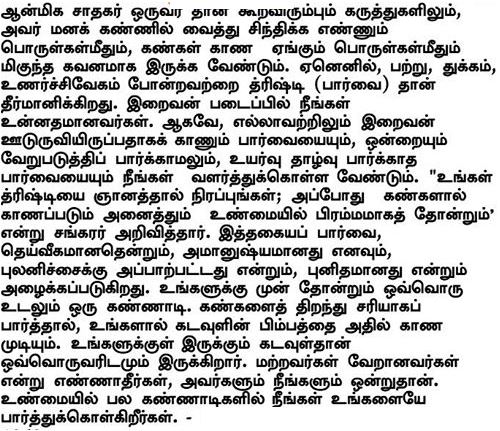 साधक को किसी एक बिंदु के बारे में बहुत सतर्क रहना पड़ता है, वह चीज़ जो कल्पना करना चाहता है, और अपनी नज़र डालने की इच्छा रखता है। इसके लिए, यह द्रष्टी (दृश्य) है जो लगाव, दुःख, जुनून, आदि का निर्णय करता है। आप अभी तक बनाए जा रहे कुलीन हैं, और इसलिए, आपको एक ऐसा नज़रिया विकसित करना होगा, जिसमें कोई ऊंचा या नीचा न दिखाई दे, जो सभी को दिव्यता से ग्रस्त देखता है। , और इसलिए, एक से अलग नहीं है। शंकर ने घोषणा की, "अपनी द्रष्टि को ज्ञान (ज्ञान) से आरोपित करो; तब देखा गया ब्रह्म के रूप में अपने वास्तविक प्रकाश में दिखाई देगा।" ऐसी दृष्टि को दिव्य, अलौकिक, अति-कामुक और शुभ कहा जाता है। आपके द्वारा देखा जाने वाला प्रत्येक शरीर एक दर्पण है जिसमें यदि आप केवल अपनी आँखें खोलते हैं तो आप भगवान की छवि देख सकते हैं। आप में से भगवान भी उनमें से प्रत्येक में है। दूसरों के अलग होने की कल्पना न करें, वे केवल आप हैं, इतने सारे दर्पणों में।