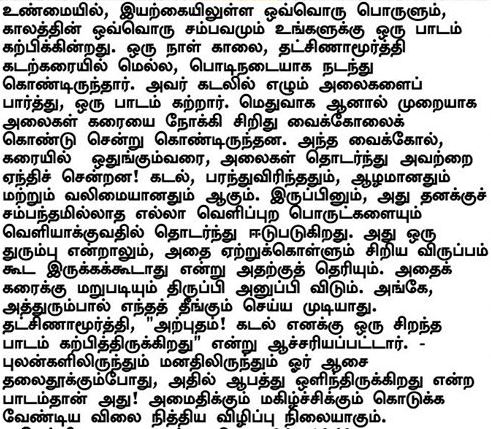 वास्तव में बोलना, प्रकृति की हर वस्तु, समय की हर घटना, आपको सबक सिखा रही है। एक सुबह, दक्षिणामूर्ति समुद्र तट पर धीमी गति से कदम रख रही थी। उसने लहरों को देखा और वहां से सबक लिया। धीरे-धीरे लेकिन व्यवस्थित रूप से लहरें तिनके के किनारे की ओर ले जा रही थीं, इसे एक शिखा से दूसरे पटल पर तब तक गुजारती रहीं, जब तक कि यह जमीन पर जमा न हो जाए! समुद्र एक व्यापक विस्तार है, गहरा और शक्तिशाली है। लेकिन फिर भी, यह लगातार सभी बाहरी चीजों से खुद को साफ करने में लगा हुआ है। यह जानता है कि, आपको एक इच्छा की उपेक्षा नहीं करनी चाहिए, इस कारण से कि यह एक तिनका है। इसे वापस किनारे पर मजबूर करें, जहां यह कोई नुकसान नहीं पहुंचा सकता है। दक्षिणामूर्ति ने कहा, "अद्भुत! समुद्र ने मुझे एक महान सबक सिखाया है" - वह सबक जो खतरे को लांघता है जब एक इच्छा जो इंद्रियों और मन से उत्पन्न होती है, अपना सिर उठाती है! शांति और खुशी की कीमत शाश्वत सतर्कता है।