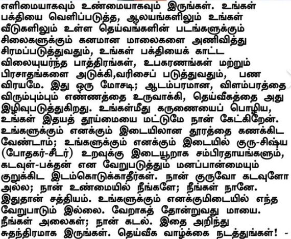 Soyez simple et sincère. C'est un gaspillage d'argent que de charger les images et les idoles dans les sanctuaires et les autels de vos maisons d'un poids de guirlandes, et de faire défiler des ustensiles, des vases et des offrandes coûteux, pour montrer votre dévotion. C'est de la tromperie ; elle rabaisse la Divinité, lui imputant le désir de pompe et de publicité. Pour doucher la grâce, je ne demande que la pureté du cœur. Ne calculez pas la distance entre vous et Moi ; n'interposez pas les formalités de la relation Guru-Sishya (précepteur-disciple), ni même les distinctions altitudinales de la relation Dieu-Devotee, entre vous et Moi. Je ne suis ni Gourou ni Dieu ; je suis Toi ; Tu es Moi - c'est la Vérité. Il n'y a pas de distinction. Ce qui apparaît ainsi est l'illusion. Vous êtes des vagues, je suis l'océan. Sachez-le et soyez libres, et menez une vie divine !