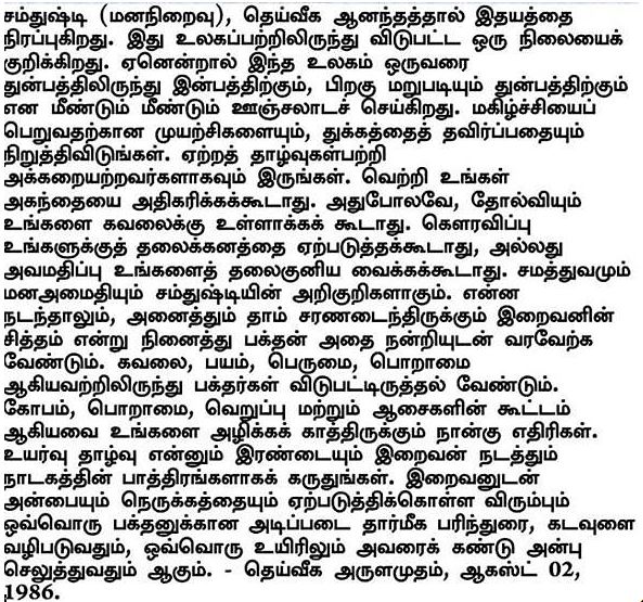 Samtushti (Zufriedenheit) erfüllt das Herz mit göttlicher Freude. Es markiert eine Stufe der Loslösung von der Welt, denn die Welt macht einen Schwung von Schmerz zu Vergnügen und wieder zurück. Verzichtet auf Versuchungen, Freude zu verdienen oder Trauer zu vermeiden und kümmert Euch nicht um die Höhen und Tiefen. Erfolg sollte Euer Ego nicht beflügeln, noch solltet Ihr bei Verlust in Niedergeschlagenheit verfallen. Ehrungen sollten Euren Kopf nicht verdrehen, noch sollten Entehrungen ihn hängen lassen. Gleichmut und Gelassenheit sind die Zeichen von Samtushti. Der Devotee muss dankbar willkommen heißen, was geschieht, wie es durch den göttlichen Willen, dem man sich ergeben hat, vorgegeben wird. Devotees müssen frei von Sorge und Angst, Stolz und Neid sein. Vier Feinde, die dich ruinieren wollen, sind Wut, Neid, Hass und Horden von Begierden. Betrachtet sowohl hohe als auch niedere als Rollen im Göttlichen Spiel. Das grundlegende moralische Rezept für jeden Gläubigen, der Gottbnahe und lieb sein will, ist, Gott anzubeten und Ihm in jedem Lebewesen Liebe zu bieten.