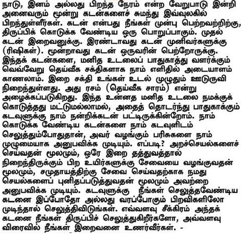 Jeder, unabhängig von Land, Rasse oder Geburtszeit, wird mit drei Schulden in die Welt hineingeboren. Eine Schuld ist eine Verpflichtung, die sich aus dem ergibt, was Ihr zuvor erhalten habt. Die erste Schuld ist dem Göttlichen geschuldet. Der zweite ist den Weisen (rishis) geschuldet. Die Dritte ist gegenüber den Eltern. Wir können diese Schulden im menschlichen Körper leicht als verschiedene göttliche Kräfte identifizieren, die ihn nähren und schützen. Göttliche Energie durchdringt Euren ganzen Körper, sie wird Rasa (Göttliche Essenz) genannt. Wir sind Gott dankbar, der uns nicht nur mit diesem kostbaren menschlichen Körper ausgestattet hat, sondern ihn auch unterstützt. Wir können diese Gaben Gottes nur dann in vollem Umfang genießen, wenn wir unsere Schulden gegenüber Gott begleichen. Wie? Indem wir rechtschaffene Taten tun, anderen Wesen dienen, die mit demselben Göttlichen ausgestattet sind, und unsere Handlungen weihen, um der Gesellschaft zu dienen. Löscht eure Schulden jetzt, oder vielleicht in vielen zukünftigen Leben, an Gott. Je früher Ihr diese Schulden zurück zahlt, je eher erkennt Ihr die Göttlichkeit.