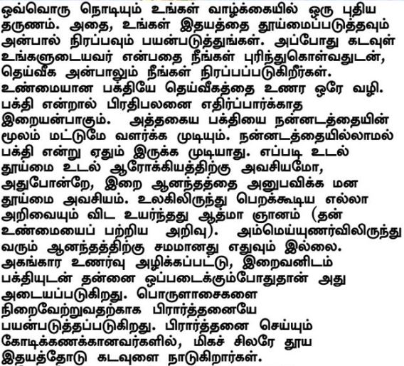 Elke seconde is een nieuw moment in je leven. Gebruik ieder moment om je hart te zuiveren en liefde te ontwikkelen. Dan zal je je bewust worden van je relatie met God en Zijn Goddelijke liefde kunnen ervaren. Oprechte devotie is de enige manier om het Goddelijke te realiseren. Toewijding betekent liefde voor God zonder verlangen naar eender welke beloning. Je kan zo’n devotie alleen ontwikkelen door juist gedrag. Zonder rechtschapenheid kan er geen toewijding zijn. Een zuivere geest is essentieel om Goddelijk Geluk te kunnen ervaren, net zoals zuiverheid van het lichaam essentieel is voor je lichamelijke gezondheid. Kennis van het Zelf (Atma jnana) is belangrijker dan alle kennis die je in de wereld kan verwerven. Het geluk dat je verkrijgt als je Zelfrealisatie bereikt is met niets te vergelijken. Je kan dit alleen bereiken als het ego overwonnen is en er een devotionele overgave is aan God. Meestal worden gebeden gebruikt om materiële verlangens te vervullen. Van de miljoenen mensen die zich tot God wenden, zijn er maar weinigen die dit doen met een zuiver hart en voor God Zelf.