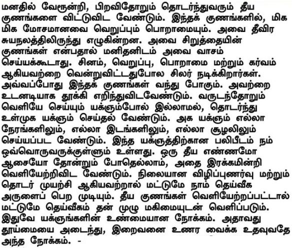 Вы должны постоянно анализировать своё поведение и стремиться избавиться от всех плохих привычек, наклонностей и качеств характера, приобретённых в прошлых воплощениях и укоренившихся в вас. Наихудшими из них являются ненависть и зависть. Они являются проявлениями эгоизма. Это животные качества, и им не должно быть места в человеке. Поскольку эти качества периодически проявляются в вас, вы должны начать избавляться от них прямо сейчас. Вот почему так важно непрерывно совершать внутреннюю работу над собой (яджну) в отличие от внешних обрядов (яджн), которые проводятся один раз в год в каком-то месте. Вы должны непрерывно при любых обстоятельствах совершать внутреннюю работу над собой и так избавиться от всех плохих качеств и развить хорошие. Всякий раз, когда появляется недобрая мысль или желание, их необходимо тут же безжалостно отбросить. Помните, что Милость Господа можно обрести только с помощью постоянного Самоконтроля, непрерывных усилий и неуклонного стремления к Богу. Только когда человек избавится от всех порочных наклонностей, Господь проявится в человеке во всём Своём Величии и Славе! Настоящая цель всех обрядов (яджн) и поклонений - помочь людям достичь Чистоты, необходимой для познания Бога.