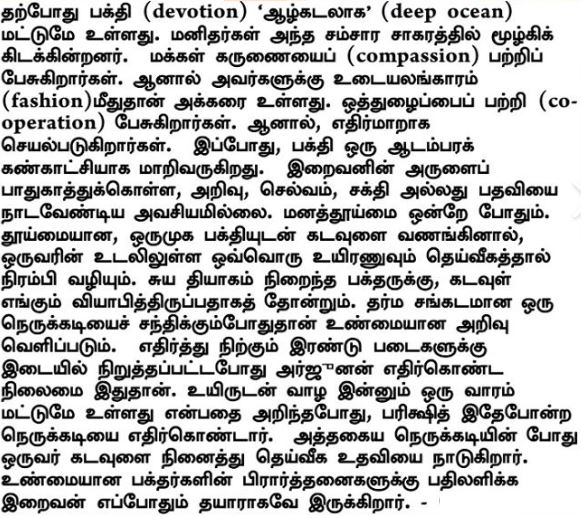 Atualmente, as pessoas e sua devoção estão submersas no oceano profundo da vida mundana. As pessoas falam sobre compaixão, mas estão preocupadas apenas com a "moda". Elas proferem a palavra "cooperação", mas só se entregam à "operação". Nos dias de hoje, a devoção está se tornando um espetáculo pomposo. Para assegurar a graça do Divino, não é necessário buscar conhecimento, riqueza, poder ou posição. A pureza da mente é suficiente. Cada célula do corpo da pessoa será preenchida com o Divino, quando Deus for adorado com devoção pura e sincera. Para o devoto abnegado, Deus será Onipresente. O verdadeiro conhecimento vem quando uma pessoa se vê confrontada por uma crise moral extrema. Essa era a situação que Arjuna enfrentou quando ele foi colocado entre os dois exércitos oponentes. Parikshit enfrentou uma crise semelhante, quando soube que tinha apenas uma semana para viver. Em meio a tais crises, a pessoa pensa em Deus e busca ajuda divina. O Senhor está sempre pronto para responder às orações de verdadeiros devotos.