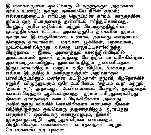 Chaque chose dans la nature a son Dharma ; l'eau a son Dharma, la nature et l'obligation de bouger ; le feu, le Dharma de brûler et de consommer ; l'aimant, d'attirer et d'attirer à lui-même. Et, chacun d'entre eux garde son Dharma inchangé, y compris le système solaire et les étoiles de l'Univers. Parmi les choses dotées de Conscience ou Chaitanya, les plantes et les arbres, les insectes et les oiseaux, nés d'œufs ou de mammifères, ont tous réussi à chérir leur Dharma sans être affectés par le passage du temps. Mais l'humanité, dont l'intelligence passe de l'inerte et de l'infinitésimal au super-conscient et à l'universel, est la seule chose vivante qui a glissé, et qui glisse. Dharma prescrit'Satyam vada' et'Dharmam chara' - Dites la vérité et pratiquez la droiture. Examinez à chaque instant de votre réveil si vous observez le Dharma ou si vous vous éloignez ? Remplissez chaque instant de pensées, de paroles et d'actes qui reflètent votre compréhension du Dharma.