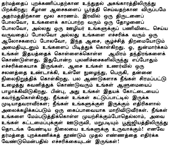 धर्म को अनदेखा करने का प्रलोभन अहंकार से बढ़ता है; कम इच्छा को पूरा करने की इच्छा ही अधर्म (अधर्म) का मूल कारण है। यह इच्छा आपको रात में चोर की तरह धूर्त और चुपचाप पकड़ लेती है, या जैसे कोई कामरेड आपको बचाने के लिए आता है, या जैसे कोई नौकर आप पर भाग लेने आता है, या आपको चेतावनी देने के लिए एक परामर्शदाता की तरह। ओह, दुष्टता आपके दिल को पकड़ने के लिए एक हजार चालें हैं। इस तरह के प्रलोभन के खिलाफ कभी भी सतर्क रहें। इच्छा आपकी चेतना में एक झनझनाहट पैदा करती है, आप में प्रवेश करती है और खुद को स्थापित करती है, कई वर्षों के श्रमसाध्य देखभाल के साथ आपके द्वारा बनाए गए व्यक्तित्वों में गुणा और खाती है। यह तब आपके दिल के किले पर कब्जा कर लेता है और आप नियंत्रण में नहीं रहते हैं; आप अपने खुद के आंतरिक दुश्मनों द्वारा चालाकी से बनाई गई कठपुतली बन जाते हैं। जब भी आप अपने आप को फिर से बनाने की कोशिश करते हैं, तो वे संरचना में घुस जाते हैं और आपको फिर से ग्राउंड जीरो से शुरुआत करनी होगी! इसलिए धर्म की अनदेखी करने वाले पहले प्रलोभन का विरोध करने के लिए सतर्क रहें!