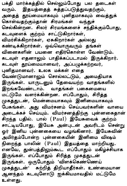 Ada banyak rintangan sepanjang jalan bhakti. Kesulitan adalah sarana untuk membersihkan hati dan membuatnya menjadi bersih dan suci. Beberapa orang menyalahkan, mengkritik dan mencemooh atau menyalahkan Tuhan ketika mereka mengalami berbagai kesulitan. Setiap orang harus menghadapi konsekuensi dari perbuatan mereka sendiri. Tuhan sama sekali tidak terpengaruh. Tuhan adalah murni, tidak ternoda dan suci. Biarkan orang-orang berkata apapun juga, namun tetaplah tenang. Jangan terlibat dalam argumentasi yang tidak diperlukan dengan siapapun juga. Argumentasi hanya menimbulkan rasa permusuhan. Selalulah berbicara lembut dan ramah dengan wajah yang tersenyum. Itu akan mendiamkan kritik. Senyuman adalah jawaban terbaik terhadap kritik. Ketika Paul sedang menghina Yesus, maka Yesus hanya mendekatinya dan memberikan sebuah senyuman yang manis. Keindahan dari senyuman Yesus telah merubah hati yang beracun dalam diri Paul. Oleh karena itu, selalulah ceria, bahkan dalam keadaan kemalangan. Selalu memasang wajah yang tersenyum, jangan pernah berjalan dengan wajah yang cemberut. Kebahagiaan hanya terdapat dalam penyatuan dengan Tuhan.