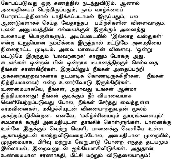 Untuk menjadi marah adalah usaha yang sesaat, namun untuk mendapatkan kedamaian, menjadi tidak terpengaruh dengan pasang surut kehidupan adalah hasil dari latihan bertahun-tahun dalam Wedanta. Kedamaian dapat dibangun hanya dengan keyakinan yang mantap bahwa semua benda-benda material yang masuk dalam jangkauan indera pada dasarnya adalah tidak ada. Semuanya itu adalah produk dari khayalan (maya), dari kecendrungan melihat banyak, dimana hanya Satu yang ada. Engkau melihat mayat satu demi satu dibawa ke kuburan, namun engkau tidak peduli; engkau merasa bahwa engkau adalah kekal. Sejatinya, engkau adalah Atma yang sesungguhnya adalah kekal! Seperti halnya air yang engkau minum dikeluarkan dalam bentuk keringat, karma yang engkau kumpulkan dikeluarkan melalui karma yang ditanggung dengan senang hati. Jadi, tanggunglah keduanya ‘kegembiraan dan penderitaan’ dengan ketenangan yang sama. Seperti halnya ruang (akasa) yang ada di dalam pot menyatu dengan ruang yang ada di luar pot, dengan tenang, sepenuhnya, tidak ada jejak perpisahan atau perbedaan, menyatu dengan Universal. Itu adalah berserah diri yang sejati, keselamatan dan kebebasan (saranagathi)!