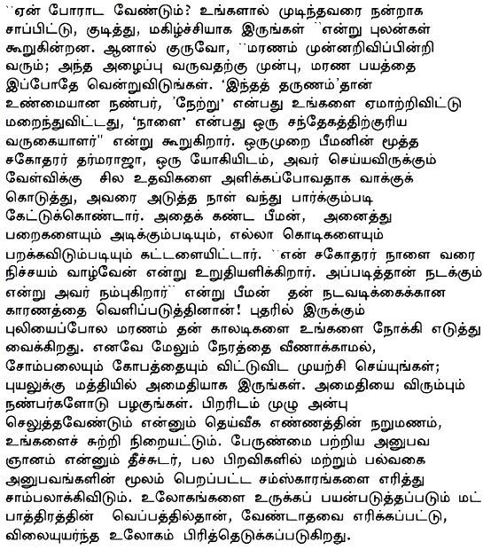 I sensi dicono: "Perché lottare? Mangia, bevi e divertiti finché puoi" ma il guru dice: "La morte arriva senza preavviso; superane la paura ora, prima che arrivi la chiamata. "Adesso" è il vero amico, "ieri" ti ha ingannato e se ne è andato, "domani" è un visitatore incerto". Una volta, quando suo fratello maggiore Dharmaraja promise a un mendicante yogi un aiuto per un sacrificio rituale e gli chiese di tornare il giorno successivo, Bhima ordinò di battere tutti i tamburi e di sventolare tutte le bandiere poiché “Mio fratello è certo che vivrà fino a domani! Almeno, questo è ciò che crede che accada". La morte insegue i vostri passi come una tigre nella boscaglia. Quindi, senza ulteriore perdita di tempo, cercate di rinunciare alla pigrizia e alla rabbia, di essere tranquilli in mezzo alle tempeste e di inserirvi in una compagnia tranquilla. Lasciate che l'aroma flagrante dei pensieri divini, pieni di amore per tutti, sorga intorno a voi. La fiamma della conoscenza sperimentale della Realtà Suprema può ridurre in cenere gli impulsi ereditati dalle molte nascite e molte esperienze. Nel calore di quel crogiolo, le scorie vengono bruciate e il metallo prezioso isolato.