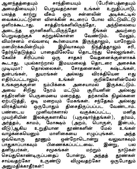 आनंद और शान्ति (आनंद और शांति) प्राप्त करने के लिए आपका दृढ़ संकल्प एक झिलमिल खिड़की पर रखे दीपक की लौ की तरह नहीं टिमटिमाना चाहिए। आपको उन्हें शास्त्रों से या उन बुद्धिमानों से प्राप्त करना सीखना चाहिए जिन्होंने उन्हें जीता है। फिर मार्ग का पालन करें, हालांकि आलोचना को तेज करें, और कोई बात नहीं जो इसे निंदनीय और निंदात्मक रूप से निंदा करता है। निंदक की हंसी एक आकांक्षी को नुकसान नहीं पहुंचाती है क्या हिमालय पर्वतमाला को हिला सकता है एक तूफान? मुसीबतों, परीक्षणों, टोलों, आघात, संकट या निराशा से पहले अपने लक्ष्य पर विश्वास न करें। वे बादलों को पार कर रहे हैं, अस्थायी छाया डाल रहे हैं, थोड़ी देर के लिए सूर्य या चंद्रमा की महिमा छिपा रहे हैं। कभी भी संदेह या निराशा से विचलित न हों। अपने जीवन की हवेली का निर्माण धर्म, अर्थ, काम, मोक्ष (धार्मिकता, समृद्धि, कामना और मुक्ति) के दृढ़ स्तंभों पर करें - प्राचीन प्रयासों द्वारा निर्धारित मानव प्रयास (पुरुषार्थ) के लक्ष्य, प्रत्येक स्तंभ मजबूत और प्रत्येक के साथ सुरक्षित है। अन्य। कभी भी खंभे को तिरछा या टेढ़ा न होने दें, क्योंकि अब कई व्यक्ति, समुदाय और राष्ट्र कर रहे हैं!