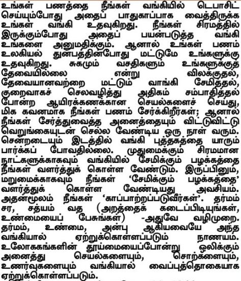 जब आप इसे वहां जमा करते हैं तो आपका बैंक आपके पैसे को सुरक्षित रखने में आपकी मदद करता है। जब आप मुश्किल में हों तो बैंक आपको इसका उपयोग करने की अनुमति देगा। लेकिन आपका पैसा आपको सांसारिक संकट में ही मदद करता है। आप इसे बहुत सावधानी से जमा करते हैं, इनकार के हजारों कृत्यों द्वारा, खुद को इस सुविधा या उस सुविधा से वंचित करते हुए, इस मद में बचत करते हैं और कम खर्च करते हैं और अधिक कमाते हैं; लेकिन एक दिन आता है जब आपको ढेर को छोड़कर खाली हाथ जाना पड़ता है। इस पासबुक को वहां नहीं देखा जाएगा। जबकि आपको वृद्धावस्था और बरसात के दिन के लिए बैंक में बचत करने की आदत विकसित करनी चाहिए, इसके लिए यह आवश्यक है कि आप develop बचत की आदत ’को उसके बाद भी विकसित करें, ताकि आप’ बचत ’कर सकें। धर्म कर्म, सत्यम् वद (सत्य कर्म करो, सत्य बोलो) - यही विधि है। अधिकार, सत्य और प्रेम उस अन्य बैंक द्वारा स्वीकृत मुद्रा है। इन धातुओं की शुद्धता के साथ बजने वाले सभी कार्यों, शब्दों और भावनाओं को जमा के रूप में स्वीकार किया जाएगा।