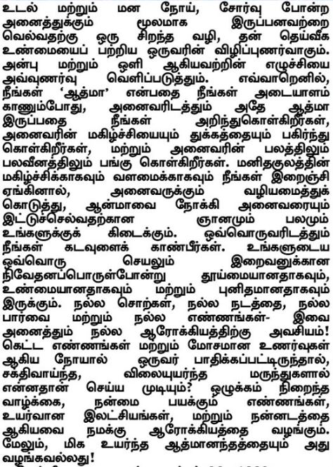 Ο μόνος αποτελεσματικός τρόπος για να κατακτήσεις όλες τις πηγές των σωματικών και νοητικών ασθενειών και αδυναμιών, είναι η επίγνωση της θεϊκής πραγματικότητάς σου. Αυτό θα επιφέρει μια έξαρση της αγάπης και του φωτός, γιατί όταν αναγνωρίζεις ότι είσαι ο Εαυτός, θα μπορείς να αναγνωρίσεις τον ίδιο εαυτό σε όλους, να μοιράζεσαι τη χαρά και τη θλίψη όλων και να συμμετέχεις στις δυνάμεις και τις αδυναμίες όλων. Όταν λαχταράς την ευτυχία και την ευημερία όλης της ανθρωπότητας, θα ευλογηθείς με τη σοφία και τη δύναμη να σηματοδοτήσεις τον δρόμο και να οδηγήσεις όλους σε αυτόν. Σε κάθε έναν θα βλέπεις τον Θεό. Κάθε πράξη σου θα είναι τότε αγνή, ειλικρινής και ιερή, ως προσφορά στον Θεό. Καλά λόγια, καλοί τρόποι, καλό όραμα και σκέψεις -αυτά είναι απαραίτητα για την καλή υγεία! Τι μπορούν να κάνουν τα ισχυρά και δαπανηρά φάρμακα αν κάποιος είναι άρρωστος με κακές σκέψεις και άσχημα συναισθήματα; Ενάρετη ζωή, ευεργετικές σκέψεις, υψηλά ιδανικά, και ενάρετη συμπεριφορά, θα απονείμουν την υγεία, και το ακόμα πιο πολύτιμο, την ευδαιμονία του Εαυτού!