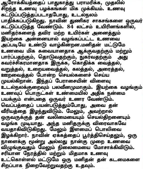 स्वास्थ्य को सुरक्षित और बनाए रखने के लिए भोजन की आदतें प्राथमिक महत्व की हैं। जब ये विनियमित नहीं होते हैं, तो स्वास्थ्य को नुकसान होता है। किसी को जीभ के जंगली कारनामों को रोकना चाहिए। जीवित मनुष्यों की 84 लाख प्रजातियों में से, सिवाय मनुष्य के सभी भोजन पर रहते हैं जैसा कि माँ प्रकृति द्वारा प्रदत्त है। अकेले आदमी ऐसे भोजन को अधिक स्वादिष्ट बनाने के लिए प्रयास करता है, उबलते, फ्राइंग और फ्रीज़िंग और मिश्रण, पीस और भिगोने से दृष्टि, स्पर्श और गंध की इंद्रियों के लिए अधिक आकर्षक होता है। इस लालच का परिणाम स्वास्थ्य और दुर्बलता है। किसी को यह महसूस करना चाहिए कि प्रकृति द्वारा प्रस्तुत खाद्य सामग्री, वास्तव में अधिक फायदेमंद हैं। जब गर्मी लागू होती है, तो वे जीवन शक्ति को कम करने वाले घटकों को खो देते हैं और शक्ति और दक्षता प्रदान नहीं कर सकते। व्यक्ति तेजी से उम्र बढ़ाता है और जवानी की फुर्ती खो देता है। जीभ के छिद्रों के लिए खानपान और दिन में तीन या चार बार भारी खाद्य पदार्थ निगलने से केवल ढेर लग सकते हैं। नियमित और सीमित इंटेक अकेले व्यक्ति को अपने कर्तव्यों का निर्वहन करने में सक्षम बना सकते हैं।