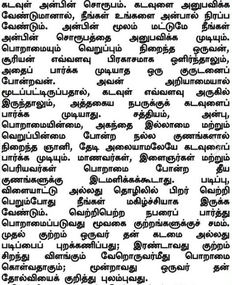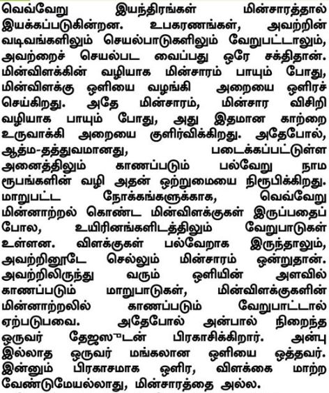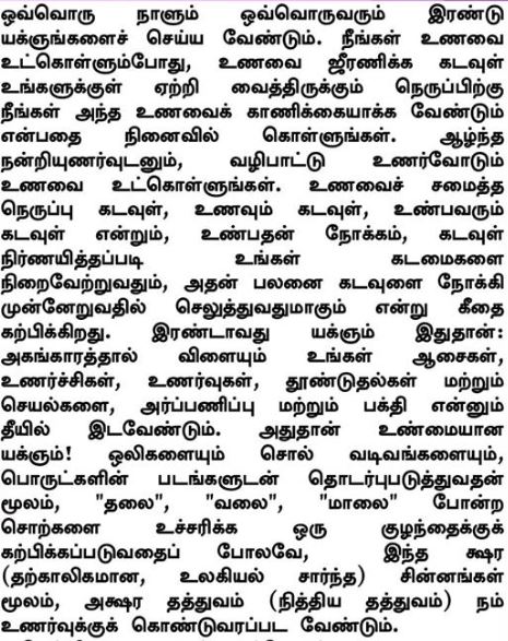 Jeder muss jeden Tag zwei Yajnas durchführen. Wenn du Essen nimmst, denk daran, opferst du dem Feuer, das Gott in dir angezündet hat, um Nahrung zu verdauen. Esse also, in einem gebeterfüllten Modus, mit tiefer Dankbarkeit. Gita lehrt, dass feuer, das das Mahl gekocht hat, Gott ist, das Essen Gott ist, der Esser Gott ist, der Zweck des Essens ist es, deine Pflichten so zu erfüllen, wie sie von Gott anvertraut wurden, und dass die Frucht dieses Werkes darin besteht, sich Gott zuzuwenden. Das zweite Yajna ist dies: Gieße deine egoistischen Wünsche, Emotionen, Leidenschaften, Impulse und Handlungen in die Flammen der Demut und Hingabe. Das ist echte Yajna! So wie ein Kind gelehrt wird, die Worte "Kopf", "Netz", "Girlande" auszusprechen, und so weiter, indem es die Klänge und Buchstabenformen mit Bildern der Objekte assoziieren lässt, so müssen auch diese kshara (temporäre und weltliche) Symbole, die Akshara tatwa (Ewiges Prinzip) )dem Bewusstsein vorgeführt werden.