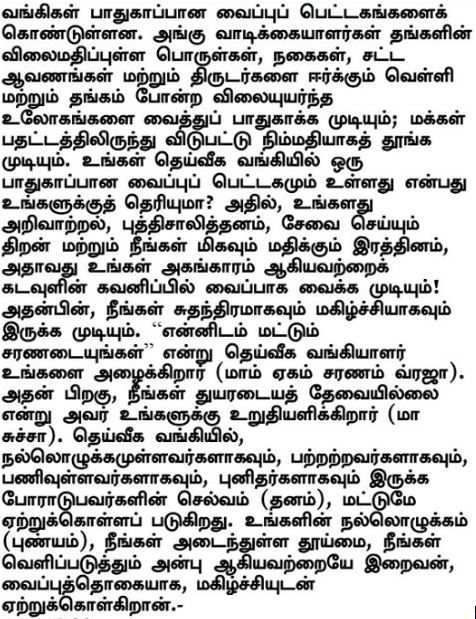 Banki posiadają bezpieczne skarbce depozytowe, gdzie klienci mogą przechowywać swoje kosztowności, klejnoty, dokumenty prawne i inne metale szlachetne, jak srebro i złoto, które przyciągają złodziei; wtedy klienci są wolni od zmartwień i mogą spać spokojnie. Czy wiesz, że twój boski bank również posiada bezpieczny skarbiec depozytowy? Złóż w nim pod opiekę Boga swoje klejnoty inteligencji, bystrości, zdolności służenia oraz kamień, który cenisz najbardziej, a mianowicie swoje ego! Wówczas będziesz wolny i szczęśliwy. Boski Bankier namawia: "Poddaj się tylko mnie (Mam ekam szaranam wradża)". Następnie zapewnia cię, że nie musisz się o nic martwić (Ma suczah). Środki (dhanam) przyjmowane w boskim banku trafiają jedynie do tych, którzy chcą być prawi i nieprzywiązani, pokorni i święci. Prawe czyny (punjam), jakie wypełniasz, czystość, jaką osiągasz i miłość, jaką okazujesz, to cenne dobra, które Pan z radością przyjmuje w depozyt.