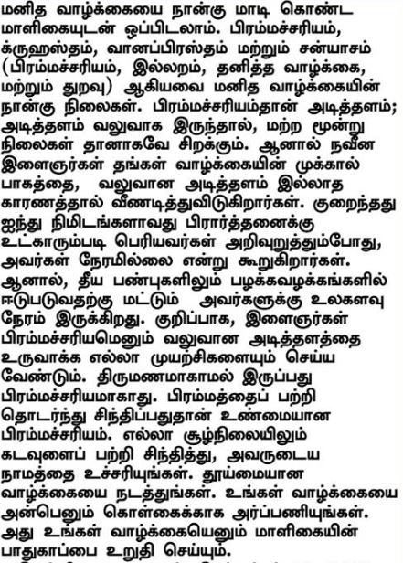 Menschenleben können mit einem vierstöckigen Herrenhaus verglichen werden. Brahmacharya, Grihastha, Vanaprastha und Sanyasa (Keuschheit, Hausarbeit, Einsiedelei und Verzicht) sind die vier Stadien des menschlichen Lebens. Brahmacharya ist die Grundlage. Wenn das Fundament stark ist, werden die anderen drei Stufen automatisch übernommen. Aber die moderne Jugend ruiniert drei Viertel ihres Lebens, weil sie kein starkes Fundament haben. Wenn die Ältesten ihnen raten, mindestens fünf Minuten für Gebete zu beten, sagen sie, dass sie keine Zeit haben, aber sie haben die ganze Zeit auf der Welt, um in schlechten Eigenschaften und Gewohnheiten zu schwelgen. Vor allem die Jugend sollte alles daran setzen, ein starkes Fundament von Brahmacharya zu schaffen. Nur Junggeselle zu bleiben, ist nicht Brahmacharya. Ständige innere Einkehr über Brahman ist wahre Brahmacharya. Denkt an Gott und singt seinen Namen unter allen Umständen. Führt ein Leben der Reinheit. Widmed Euer Leben dem Prinzip der Liebe. Dies gewährleistet die Sicherheit des Herrenhauses Eures Lebens.