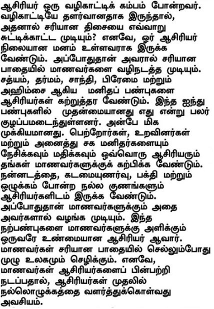 एक शिक्षक एक मार्गदर्शक की तरह होता है। यदि गाइडपोस्ट खुद ही ढीला है, तो यह सही दिशा की ओर कैसे संकेत कर सकता है? तो, एक शिक्षक के पास एक स्थिर दिमाग होना चाहिए। तभी कोई छात्रों को सही रास्ते पर ले जा सकता है। शिक्षक को सत्य, धर्म, शांती, पूर्व और अहिंसा के मानवीय मूल्यों को लागू करना चाहिए। कई लोग भ्रमित हैं कि इन पाँचों में सबसे महत्वपूर्ण मूल्य क्या है। प्रेम का सर्वाधिक महत्व है। प्रत्येक शिक्षक को अपने छात्रों को अपने माता-पिता, रिश्तेदारों और सभी साथी प्राणियों से प्यार और सम्मान करना सिखाना चाहिए। शिक्षकों के पास शुद्ध हृदय होना चाहिए और सत्य, अच्छे आचरण, कर्तव्य, भक्ति और अनुशासन का पालन करना चाहिए, ताकि वे छात्रों को वही प्रदान कर सकें। वह या वह अकेले, जो इन गुणों को छात्रों को प्रदान करते हैं, सच्चे अर्थों में एक शिक्षक हैं। पूरी दुनिया समृद्ध होगी, जब छात्र सही रास्ते पर चलेंगे। इसलिए एक शिक्षक की ओर से यह आवश्यक है, जिसे छात्रों को सद्गुणों की खेती करने के लिए बाध्य किया जाता है।