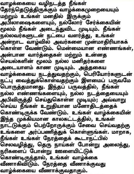 The kind of life you choose to lead and the aspirations which you have in your mind can be achieved if you are in the company of good people. You must cultivate friendship with good people and follow their example in your daily routine. Good people can be recognised by their gentle thoughts, loving words and noble deeds. Youth is the appropriate age for you to lead such a life and put yourself in the company of elders. During this age, you will be able to develop good ideas and good conduct; you should make a firm determination to do so. At this important stage of your life, dedicate yourself to the service of your country and to the service of your parents. On the contrary, if you spend your time in bad company and wander about the streets like stray dogs and whistle like foxes, you will be wasting your life. Time wasted is life wasted.