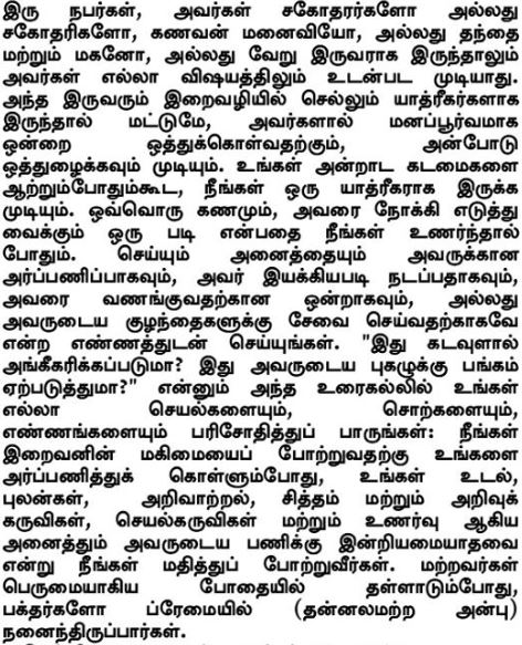 कोई भी दो व्यक्ति किसी भी मामले पर सहमत नहीं हो सकते हैं, चाहे वे भाई या बहन, जीवन साथी या पिता और पुत्र हों। यह केवल ईश्वरीय पथ पर तीर्थयात्रियों के रूप में है जो दो दिल से सहमत हो सकते हैं और प्यार से सह सकते हैं। आप अपने दैनिक कर्तव्यों में भाग लेते हुए भी तीर्थयात्री हो सकते हैं। केवल, आपको यह महसूस करना होगा कि प्रत्येक क्षण उसका एक कदम है। उनके द्वारा समर्पित के रूप में, उनके आराधना के लिए या अपने बच्चों की सेवा के लिए काम के रूप में उन्हें सब कुछ करें। इस टचस्टोन पर अपने सभी कार्यों, शब्दों, विचारों का परीक्षण करें: "क्या यह भगवान द्वारा अनुमोदित किया जाएगा? जब आप अपने आप को प्रभु की महिमा के लिए समर्पित करते हैं, तो आप शरीर, इंद्रियों, बुद्धि, इच्छा और ज्ञान, कर्म और महसूस के सभी उपकरणों को अपने काम के लिए आवश्यक रूप से श्रद्धेय करेंगे। जबकि अन्य लोग गर्व के साथ नशे में हो जाएंगे, भक्त को प्रेमा (निःस्वार्थ प्रेम) से पीड़ित किया जाएगा।