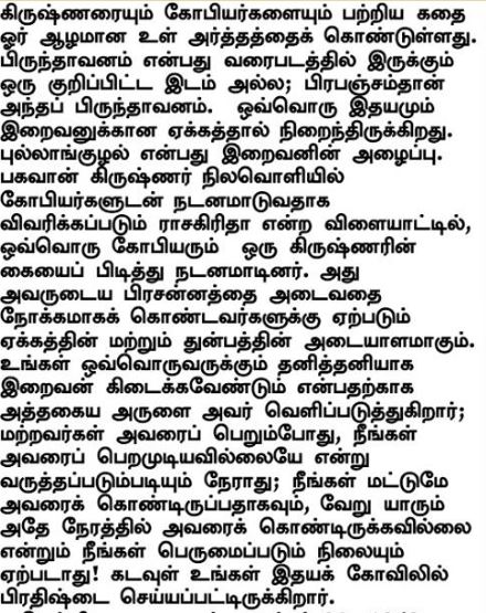 إن قصة المولى كريشنا وفتيات الغوبال أي راعيات الأبقار لها معنىً باطني عميق. مدينة بريندافان ليست مكاناً محددا على الخريطة، إنما هي الكون بحد ذاته؛ وكل قلبٍ مملوء بالشوق للمولى العظيم، والناي هو نداء المولى. في أحد المقاطع يصفون المولى كريشنا يرقص مع فتيات الغوبال تحت ضوء القمر، وكل فتاة كان كريشنا يمسك بيدها في الرقصة؛ وهذا الوصف هو رمزٌ للتشوق والمشقة التي يكابدها أولئك الطامحون لبلوغ أعتاب حضرته المقدسة. يغدق المولى مثل هذه البركات لدرجة أن كل واحدٍ منكم لديه المولى كله بداخله، فلا حاجة للحزن بأنكم لم تجدوه عندما يصرح الآخرون أنهم وجدوه؛ كما لا حاجة للفخر والتكبر بأنكم وجدتموه وبنفس الوقت لا أحد سواكم قد وجده! المولى هو الساكن القائم في محراب قلبكم!