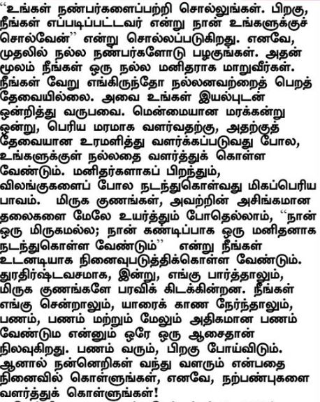 Diz-se: “Diga-me com quem andas, que te direi quem és”. Assim, primeiramente, ande em boa companhia. Então, você se tornará um bom indivíduo. Você não precisa adquirir a bondade em algum lugar, pois ela é inerente à sua natureza. Você deve cultivar a bondade dentro de si mesmo, assim como um tenro broto é nutrido e cuidado para se tornar uma grande árvore. Tendo nascido como um ser humano, é uma grande falta comportar-se como um animal. Sempre que as qualidades animais se manifestarem, você deve se lembrar imediatamente: “Eu não sou um animal. Eu devo agir como um ser humano”. Infelizmente, atualmente, para onde quer que você olhe, as qualidades animais estão fora de controle. Aonde quer que você vá e com quem quer que você se depare, haverá apenas um desejo: dinheiro, dinheiro e mais dinheiro. Lembre-se: o dinheiro vem e vai, mas a moralidade vem e cresce! Portanto, cultive e cresça em valores morais!