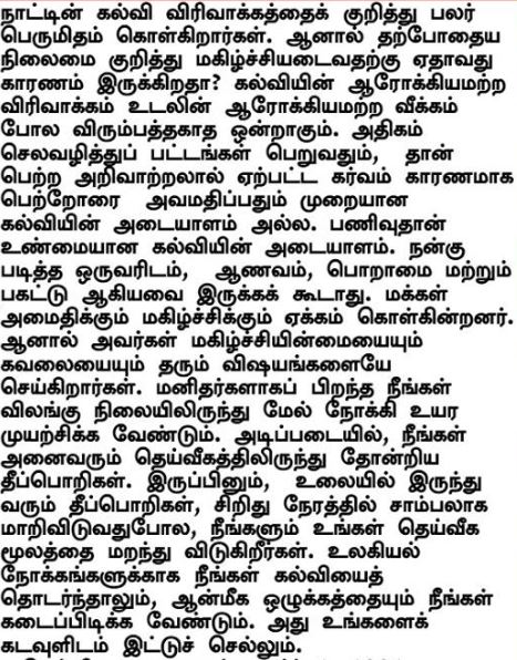 Velen zijn trots op de enorme uitbreiding van het onderwijs in het land. Maar is er wel reden om blij te zijn met de huidige situatie? Een ondoordachte uitbreiding van het onderwijs is even ongewenst als een ongezond opgeblazen lichaam. Het behalen van diploma's tegen hoge kosten en uit intellectuele hoogmoed en minachting voor de ouders ontwikkelen zijn geen teken van een degelijke educatie. Nederigheid is het kenmerk van ware educatie. Arrogantie, afgunst en uiterlijk vertoon horen niet bij een goed opgeleid persoon. Mensen hunkeren naar innerlijke vrede en geluk, maar doen dingen die hen ongelukkig en bezorgd maken. Omdat je als mens geboren bent, dien je je in te spannen om het dierlijke te overstijgen. Jullie zijn in wezen allemaal vonken van het Goddelijke. Maar zoals vonken uit een oven na een tijdje tot as vergaan, vergeten jullie je Goddelijke oorsprong. Terwijl je een wereldse opleiding nastreeft, dien je ook spirituele discipline te beoefenen, wat je naar God zal leiden.