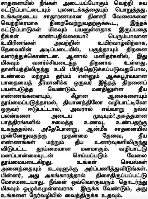 Keberhasilanmu dalam Sadhana tergantung dari pengendalian diri dan pengendalian indera. Bahkan keberhasilan dalam menjalankan tugasmu sehari-hari bukankah pengendalian kedua hal ini sangat bermanfaat? Kebanyakan makhluk hidup mengembangkan kemampuan membedakan sesuai dengan kebutuhan yaitu untuk bisa bertahan hidup. Namun untuk manusia, kemampuan membedakan ini telah menjadi keahlian sangat dikembangkan. Seseorang harus menggunakan keahlian ini untuk memisahkan sekam dari butir padi dan memutuskan pada jalan kebenaran dan kebajikan. Tanpa membersihkan pikiran dari gagasan yang jahat serta keinginan rendahan, bagaimana seseorang bisa mencapai hasil yang baik dari meditasi dan doa? Makanan yang dimasak dalam wajan yang kotor adalah tidak layak untuk dimakan. Sama halnya, kebutuhan mendasar untuk kemajuan latihan spiritual adalah bebas dari gagasan dan perasaan yang jahat. Kerja disucikan dengan sebuah sikap pemujaan. Dedikasikan semua aktifitasmu kepada Tuhan, kemudian, kerja itu tidak akan dibungkus dan diperburuk oleh ego. Setiap orang darimu harus melanjutkan untuk tetap disiplin dan itu yang akan membuatmu tetap di jalan yang lurus.