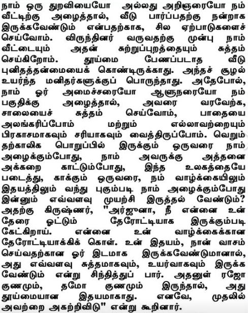 Si nous invitons un grand saint ou un grand savant chez nous, des préparatifs seront faits à la maison, pour la rendre présentable. Nous nettoyons notre maison et ses alentours avant l'arrivée du client. Une maison qui n'est pas propre manque de sacralité et n'est pas appropriée pour les grandes personnes. De même, si nous invitions un ministre ou un gouverneur dans notre quartier, nous nettoierions la route, décorerions le sentier et garderions tout ce qu'il y a de lumineux et de propre pour recevoir le visiteur éminent. Si nous nous soucions tant quand nous invitons quelqu'un avec un poste temporaire, combien plus d'effort est nécessaire quand nous invitons le Créateur et Protecteur du monde Lui-même à entrer dans nos vies et nos cœurs ? remarqua Krishna : "Arjuna, tu me demandes d'être le conducteur de ton char. Prends-Moi comme le chef de file de ta vie. Pense à la propreté et à la grandeur de ton cœur pour en faire un siège pour Moi. Tant que Rajo et Tamo gunas sont là, le cœur n'est pas pur. Par conséquent, pour commencer, enlevez-les."