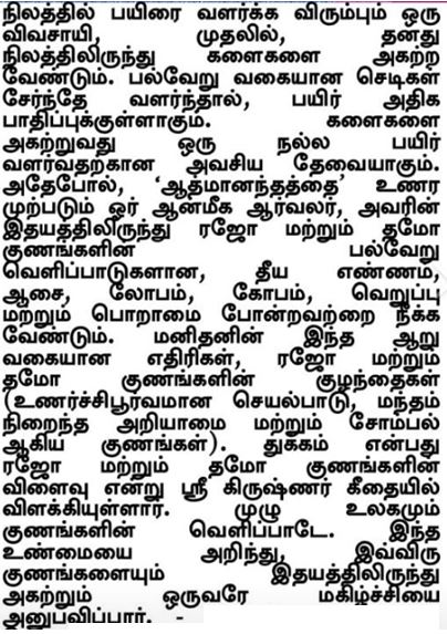 Ein Landwirt, der eine Ernte auf dem Feld anbauen will, muss von vornherein das Unkraut von seinem Feld entfernen. Wenn verschiedene Arten von Unkraut wachsen, wird die Ernte beeinträchtigt. Das Entfernen des Unkrauts ist eine wesentliche Voraussetzung für eine gute Ernte. Ebenso muss ein spiritueller Aspirant, der 'Atma-ananda' (die Freude der Glückseligkeit) erkennen will, die verschiedenen Manifestationen von Rajo und Tamo gunas in Form von Bosheit, Verlangen, Gier, Wut, Hass und Eifersucht aus dem Herzen entfernen. Diese sechs Arten von Feinden des Menschen sind die Kinder von Rajo und Tamo gunas (Eigenschaften der leidenschaftlichen Aktivität, stumpfe Ignoranz und trägheit). Sri Krishna erklärte in der Gita, dass Trauer die Frucht von Rajo und Thamo gunas ist. Die ganze Welt ist eine Manifestation von Gunas. Nur wer diese Wahrheit erkennt und die beiden Eigenschaften aus dem Herzen entfernt, wird glücklich sein.