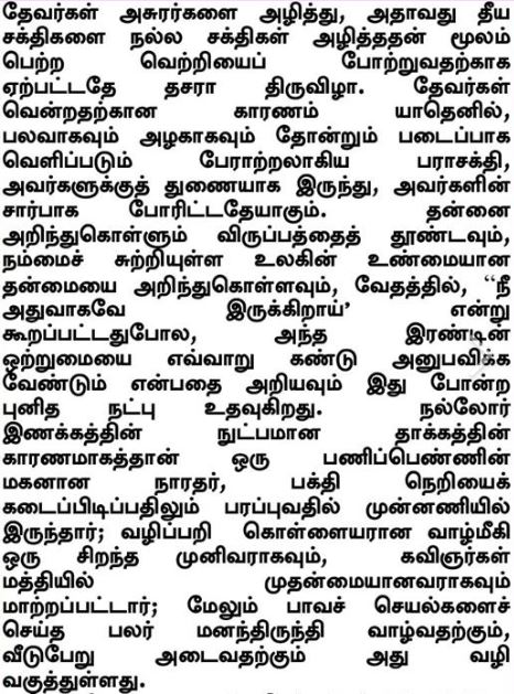 Das Dasara-Fest ehrt den Sieg der Devas (Gott) über die Asuras (Dämonen) - die Kräfte der Gerechtigkeit über die Kräfte des Bösen. Sie gewannen, weil Parashakthi (der dynamische Aspekt der Göttlichkeit), die Macht, die Gott zu all dieser Vielfalt und Schönheit ausgearbeitet hat, kam, um ihnen Beistand zu geben und für sie zu kämpfen. Heilige Gesellschaft wie diese hilft, den Wunsch zu wecken, sich selbst zu kennen, die wahre Natur der Welt um uns herum zu kennen und zu wissen, wie man die Einheit beider entdeckt und erlebt, ausgedrückt als das vedische Diktum ,Die-Du-Kunst'. Durch den subtilen Einfluss der Gesellschaft, in die er aufgenommen wurde, verwandelte sich Narada, der Sohn einer Magd, in den führenden Praktizierenden und Exponenten von Bhakti-marga (Pfad der Hingabe); dass Valmiki, ein Straßenräuber, in einen großen Weisen vor allem unter den Dichtern verwandelt wurde; und dass vielen Sündern der Weg der Umkehr und erlösen gezeigt wurde.