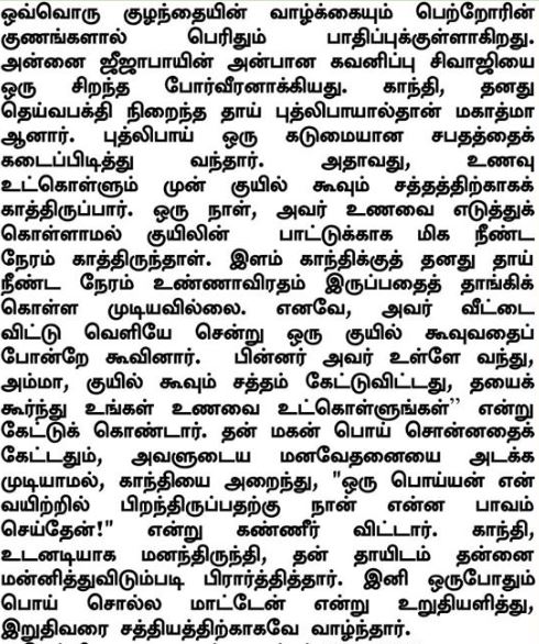 Setiap kehidupan seorang anak adalah sangat dipengaruhi oleh kualitas dari orang tuanya. Kepedulian kasih sayang dari ibu Jijabai membuat Shivaji menjadi seorang pejuang yang hebat. Gandhi menjadi seorang Mahatma karena ibunya yang mulia yaitu ibu Putlibai. Putlibai menjalankan sebuah disiplin yang ketat dimana beliau akan menunggu bunyi burung tekukur sebelum makan. Pada suatu hari, ibu Putlibai menunggu sangat lama sekali untuk bunyi burung tekukur itu sampai tidak makan. Gandhi kecil tidak tahan melihat ibunya berpuasa dalam jangka waktu yang lama. Karena itu, Gandhi keluar dari rumah dan menirukan suara burung tekukur itu. Kemudian Gandhi masuk ke dalam rumah dan berkata kepada ibunya, "Ibu, silahkan makan sekarang karena kita telah mendengar bunyi burung itu." Karena tidak mampu menahan kesedihan karena anaknya berbohong, Ibu Putlibai menampar Gandhi dan menangis, "Apa dosa yang telah aku lakukan sehingga seorang pembohong lahir dari rahimku!" Gandhi dengan segera menyesal dan memohon maaf mendalam kepada ibunya. Gandhi bersumpah bahwa dia tidak akan pernah lagi mengucapkan kebohongan, dan hidup untuk kebenaran sampai akhir hayat.