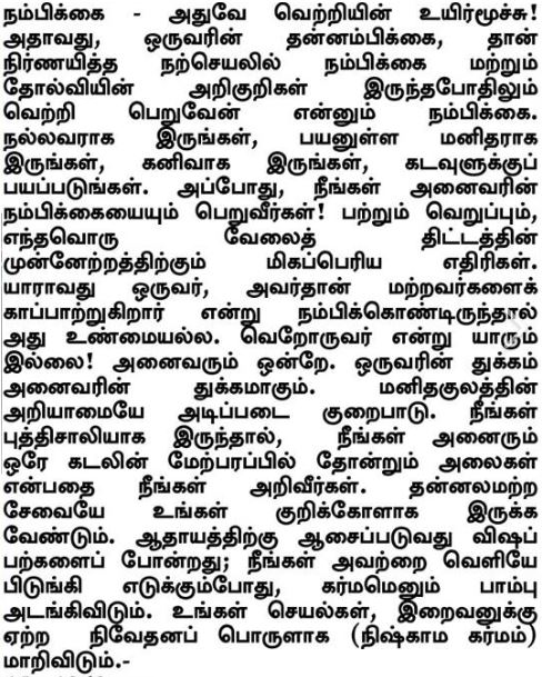 Fé: esse é o próprio sopro da vitória! Fé em si mesmo, fé na boa obra em que se engajou e fé em seu sucesso, apesar dos sinais de fracasso. Seja bom, seja útil, seja gentil, seja temente a Deus, pois assim você ganhará a confiança de todos! Apego e ódio são os maiores inimigos do progresso em qualquer tipo de trabalho. Se alguém se ilude acreditando que está salvando outros, então coitado dele, pois não há outros, de forma alguma! Todos são um, a tristeza de uma pessoa é a tristeza de todos. A ignorância da humanidade é a falha fundamental. Se você fosse sábio, saberia que todos os indivíduos são ondas na superfície do mesmo oceano. Ação altruísta é o ideal que você deve buscar. O desejo de ganhar é como presas venenosas. Quando você as remover, a serpente do karma (ação) ficará inofensiva e suas ações se tornarão uma oferenda digna (nishkama karma)!