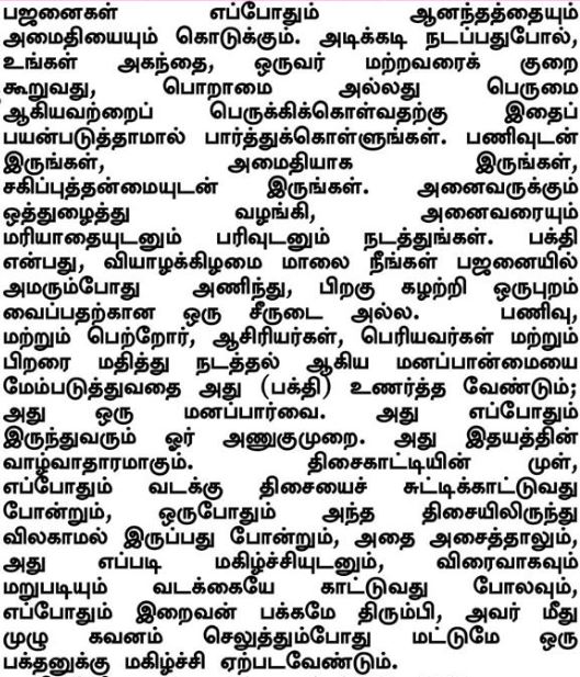 Οι ψαλμοί-μπάτζανς προσφέρουν πάντοτε χαρά και γαλήνη. Να προσέχετε να μη συμμετέχετε σ’ αυτά για τη διόγκωση του εγώ σας ή για την καλλιέργεια αντεγκλήσεων, φθόνου ή αλαζονείας, όπως συχνά συμβαίνει. Να είστε ταπεινοί, γαλήνιοι, ανεκτικοί. Να συνεργάζεστε με όλους και ν’ αντιμετωπίζετε τους πάντες με ευγένεια και καλοσύνη. Η αφοσίωση δεν είναι μια φορεσιά για τα βράδια της Πέμπτης, όταν συγκεντρώνεστε για τα μπάτζανς, την οποία στη συνέχεια αφήνετε στην άκρη, όταν αυτά τελειώσουν. Πρέπει να σημαίνει την προώθηση μιας στάσης ταπεινότητας, σεβασμού των γονέων, των δασκάλων, των πρεσβυτέρων. Είναι μια νοητική θεώρηση, μια στάση ζωής πάντοτε παρούσα. Είναι αυτή που δυναμώνει την καρδιά, όπως ακριβώς η τροφή δυναμώνει και συντηρεί το σώμα. Όπως η βελόνα της πυξίδας δείχνει πάντοτε προς τον βορρά, χωρίς ποτέ να αποκλίνει απ’ αυτή την κατεύθυνση και επιστρέφει σ’ αυτήν εύκολα, πρόθυμα και γρήγορα οποτεδήποτε μετακινείται απ’ αυτήν τη θέση, έτσι και ο πιστός πρέπει να είναι πάντοτε στραμμένος προς τον Κύριο και να είναι χαρούμενος, μόνον όταν είναι εστιασμένος σ` Εκείνον.