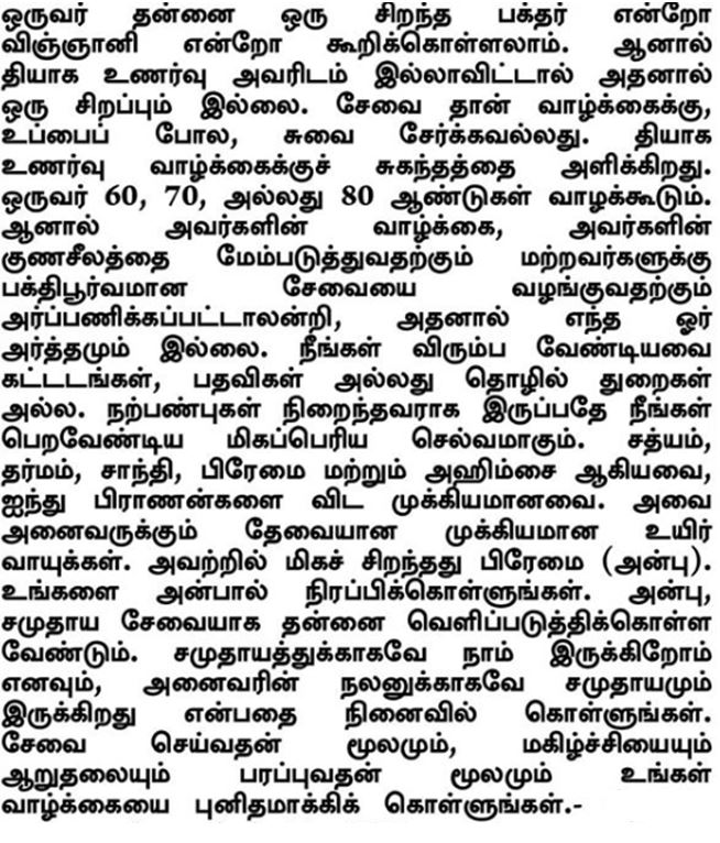 Uma pessoa pode se intitular um grande devoto ou cientista, mas, sem espírito de sacrifício, não há grandeza. Serviço (seva) é o sal que dá sabor à vida. O espírito de sacrifício transmite fragrância à vida. Pode-se viver por 60, 70 ou 80 anos. No entanto, esses anos não terão sentido, a menos que sua vida tenha sido dedicada ao aprimoramento de seu caráter e à prestação de serviço devotado aos outros. Você não deve aspirar a edifícios, cargos ou indústrias. Um bom caráter é a maior riqueza que você pode adquirir. Mais vital que os cinco pranas (energias vitais) são sathya (Verdade), dharma (Retidão), shanti (Paz), prema (Amor) e ahimsa (Não violência). Esses são o alento vital para todos. Dentre esses, o maior é prema. Preencha-se de amor. O amor deve se expressar como serviço à sociedade. Considere que existimos para a sociedade e a sociedade existe para o bem de todos. Santifique sua vida prestando serviço e espalhando felicidade e conforto por toda parte.