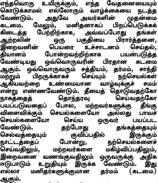 Todos devem levar suas vidas de tal forma que nenhuma dor seja infligida a qualquer coisa viva. Esse é o dever supremo de todos. Além disso, é dever primordial de todos os que tiveram a chance deste nascimento humano, ocasionalmente, guardar parte de suas energias para oração, repetição do nome do Senhor, meditação, etc. Todos devem concordar em viver na verdade, retidão, paz e realizar boas obras de serviço aos outros. Uma pessoa deve ter tanto medo de praticar atos prejudiciais ou ações maldosas contra os outros, quanto tem de tocar no fogo ou perturbar uma cobra. É preciso ter tanto apego e firmeza na realização de boas obras, na busca da felicidade de outras pessoas e na adoração ao Senhor, quanto se tem hoje na acumulação de ouro e riquezas. Este é o dever (dharma) de todos os seres humanos.