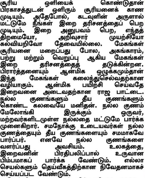 O Sol refulgente pode ser visto apenas com sua própria luz. Da mesma forma, somente através da graça de Deus você pode obter uma visão do Divino. Nenhuma habilidade, esforço intelectual ou conhecimento é necessário para experimentar Deus. Assim como as nuvens podem obscurecer o Sol, as nuvens do egoísmo, apego e ódio impedem que se veja o Divino. Oração e disciplina espiritual (sadhana) são os meios pelos quais essas nuvens são dispersas. Sadhana é a estrada majestosa para alcançar o Divino. A constituição humana é uma mistura de boas e más características. Aquele no qual os bons traços predominam tende a ver apenas o bem nos outros. Aqueles que têm a visão equânime veem as boas e más qualidades de maneira imparcial. É necessário, portanto, cultivar boas qualidades. O mundo deve ser visto como a imagem refletida do Divino. Todos os atos devem ser feitos como uma oferta ao Divino.