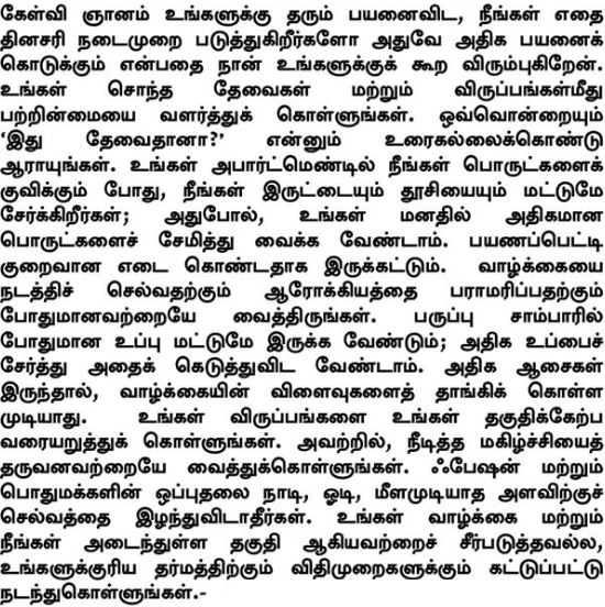 Aku ingin mengatakan kepadamu, bukan apa yang engkau dengar yang bermanfaat, namun apa yang engkau jalankan dalam kehidupan sehari-hari. Kembangkan penyangkalan terhadap kebutuhan dan harapanmu sendiri. Periksa masing-masing bagian itu di atas batu uji esensialitas (mendasar). Ketika engkau menumpuk barang-barang di dalam apartemenmu, engkau hanya memperbanyak kegelapan dan debu; begitu juga, jangan mengumpulkan dan menyimpan begitu banyak material di dalam pikiranmu. Lakukan perjalanan dengan ringan. Miliki secukupnya untuk menopang kehidupan dan menjaga kesehatan. Pappu (makanan terbuat dari kacang-kacangan) harus diisi dengan cukup uppu (garam) untuk membuatnya enak; artinya, jangan menyia-nyiakan makanan dengan menambahkan terlalu banyak garam. Hidup menjadi terlalu sulit untuk dihadapi jika engkau menaruh terlalu banyak keinginan di dalamnya. Batasi keinginanmu pada kapasitasmu dan bahkan diantara keinginan itu, miliki hanya keinginan yang memberikan suka cita yang abadi. Jangan mengejar mode dan persetujuan publik dan menyiksa sumber dayamu melampaui perbaikan. Selain itu, berpegang pada dharmamu sendiri dan pedoman aturan yang mengatur hidup atau tahapan yang telah engkau capai.