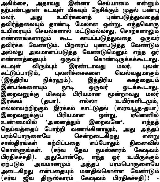 Ahimsa, la virtud de la no violencia, es la primera flor virtuosa que Dios más ama. Esto involucra mucho más que abstenerse de dañar a seres vivos. Uno debería desistir de causar dolor a cualquier ser vivo no solo a través de las acciones, sino incluso con palabras y pensamientos. Uno no debería albergar ninguna idea de herir o humillar a otro. La segunda flor que Dios desea es el control y dominio de los sentidos (indriya nirgaham). Uno no debería correr tras los placeres sensuales y el gozo sensorial. La tercera flor que es muy amada por el Señor es l compasión (daya). La compasión hacia todos los seres vivos y todas la cosas le complacen al Señor (Sarvabhuta-daya), ya que ¡'Todo es Dios', ciertamente! Deben recordar siempre que las escrituras nos enseñan que la adoración y respeto dado a cualquier dios alcanza al Supremo (Sarva deva namaskaram Keshavam prati gacchati). Esto debe tenerse en cuenta con la misma validez que: ¡La humillación a cualquier ser vivo alcanza al Supremo (Sarva Jeeva thiraskaram Keshavam prathigacchati)!