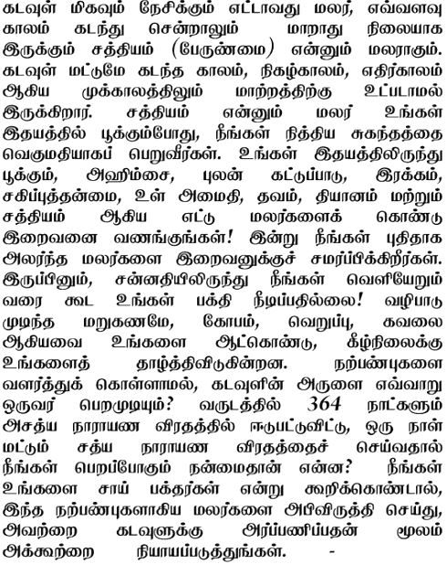 Ósmym kwiatem, jaki Bóg bardzo lubi, jest prawda (satjam) - ta, która nie zmienia się z upływem czasu. Sam Bóg pozostaje niezmienny od przeszłości, przez teraźniejszość, po przyszłość. Gdy kwiat prawdy zakwitnie w twoim sercu, otrzymasz nagrodę, jaką będzie trwały zapach. Czcij Pana, ofiaruj Mu osiem kwiatów - niekrzywdzenie, kontrolę zmysłów, współczucie, wyrozumiałość, pokój wewnętrzny, ascezę, medytację i prawdę - które wyrastają z twojego serca! Dzisiaj ofiarujesz świeże kwiaty, a twoje oddanie nie utrzyma się nawet do chwili, gdy wyjdziesz z pokoju modlitwy! Jak tylko skończysz oddawać cześć, ogarnie cię gniew, nienawiść i niepokój i doprowadzi do upadku. Jak ktoś może zdobyć łaskę Boga, nie rozwijając prawych cech? Zaangażowany w asatjanarajana wratę (trzymanie się kłamstwa) przez 364 dni w roku, jakiego dobra się spodziewasz, wykonując Satjanarajana wratę w ostatnim dniu roku? Skoro uważasz się za wielbiciela Sai, dowiedź swoich słów, pielęgnując te kwiaty cnoty i ofiarowując je Bogu.