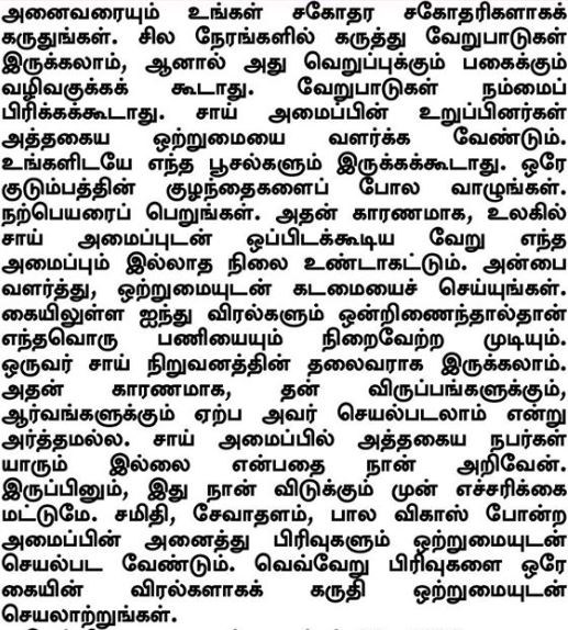 عاملوا الجميع كأخوة وأخواتٍ لكم، فربما يكون هناك اختلافات في الرأي بعض الأحيان إلا أن ذلك ينبغي ألا يقود للكراهية والعداوة. ينبغي ألا تفرقنا الاختلافات بل نبقى متحدين وعلى عناصر منظمة ساي دعم مثل هذه الأحدية. لا تفسحوا مجال لأي خلافات، وعيشوا كأطفالٍ ينتمون لنفس العائلة. اكسبوا سمعة طيبة فلا يكون هناك منظمة أخرى تُقارن بمنظمة ساي في العالم كله. ركزوا على تنمية المحبة واعملوا بيدٍ واحدة، إذ فقط عندما تجتمع أصابع اليد الخمسة مع بعضها البعض يمكنها إنجاز أي مهمة. ربما يكون أحدكم بمنصب رئيس المنظمة، فهذا لا يعني أنه بوسعه التصرف وفقاً لأهوائه ورغباته، وأنا مدركٌ تماماً لعدم وجود مثل هؤلاء الأشخاص في منظمة ساي. ومع ذلك فقط أنبهكم. ينبغي لكل أجنحة المنظمة إن كان جناح ساميتي، سيفادل، بالفيكاس، إلخ أن يعملوا بتناغم وانسجام. اعتبروا أجنحة المنظمة المختلفة كمثل أصابع اليد الواحدة واعملوا بروحٍ واحدة.