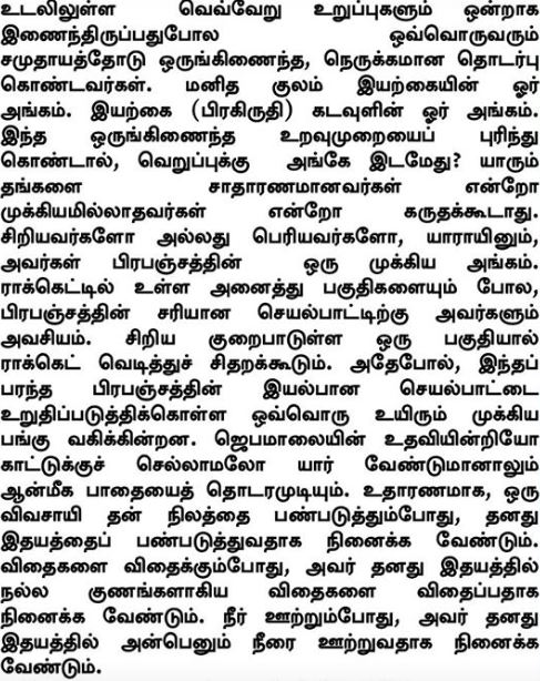 Die Einzelnen sind ganzheitlich mit der Gesellschaft verbunden wie verschiedene Organe in einem Körper. Die Menschheit ist ein Glied der Natur und die Natur (Prakruti) ist ein Glied Gottes. Wenn diese ganzheitliche Beziehung verstanden wird, wo ist dann der Grund für Hass? Keiner sollte sich selbst als unbedeutend oder unwichtig betrachten. Jeder, ob klein oder groß, ist ein wichtiger Teil des Ganzen und für sein ordnungsgemäßes Funktionieren, so wie alle Teile einer Rakete, unerlässlich. Jedes kleine kaputte Teil kann dazu führen, dass die Rakete explodiert. Ebenso spielt in diesem riesigen Kosmos jedes Wesen eine wichtige Rolle, um sein reibungsloses Funktionieren zu gewährleisten. Jeder kann den spirituellen Weg, ohne Hilfe eines Rosenkranzes oder mit dem Weg in den Walda, verfolgen. Zum Beispiel sollte ein Landwirt, der das Feld bebaut, denken, dass er das Feld seines Herzens bebaut. Während er Samen sät, muss er denken, dass er die Samen guter Eigenschaften in seinem Herzen sät, und während er wässert, sollte er denken, dass er das Feld seines Herzens mit Liebe wässert.