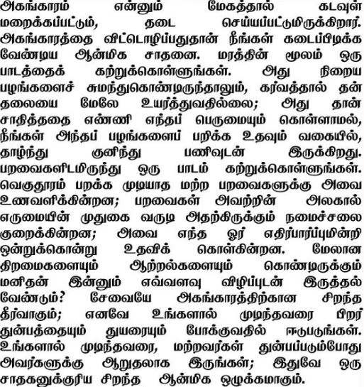 Deus está escondido e obstruído pelas nuvens do egoísmo. Livrar-se do egoísmo é a disciplina espiritual (sadhana) a ser praticada. Aprenda uma lição com a árvore. Quando ela está cheia de frutos, não levanta a cabeça por orgulho. Pelo contrário, ela se abaixa e se inclina, como se não levasse nenhum crédito por sua realização e como se ajudasse você a colher seus frutos. Aprenda uma lição com os pássaros. Eles alimentam aqueles que não podem voar para longe. O pássaro alivia a coceira do búfalo coçando-o com o bico. Eles se ajudam e se servem mutuamente, sem pensar em recompensa. Quão mais atento o homem deve estar com suas habilidades e faculdades superiores? Serviço é a melhor cura para o egoísmo. Então, engaje-se para aliviar a dor e o sofrimento, na medida de suas possibilidades. Tente amenizar, o quanto for possível, as aflições dos outros. Esse é o melhor sadhana para o aspirante.