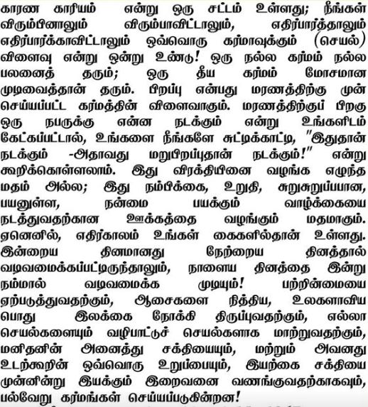 Ada sebuah hukum sebab dan akibat; setiap karma (perbuatan) memiliki sebuah konsekuensi, apakah engkau menyukainya, mengantisipasinya atau tidak menyukainya! Sebuah karma yang baik menghasilkan hasil yang baik; karma yang buruk akan menghasilkan hasil yang buruk. Kelahiran adalah hasil dari karma yang dilakukan sebelum kematian. Jika engkau ditanyakan apa yang terjadi pada seseorang setelah kematian, engkau dapat menunjukkan dirimu sendiri dan menyatakan, "inilah yang terjadi – kelahiran kembali terjadi!” ini bukanlah agama keputusasaan; ini adalah agama harapan, kepastian, dorongan untuk menjalani sebuah kehidupan yang aktif, berguna dan bermanfaat. Karena masa depan ada di tanganmu sendiri. Walaupun hari ini sudah dibentuk oleh hari kemarin, hari esok dapat dibentuk melalui hari ini! Berbagai jenis karma dilakukan untuk menimbulkan tanpa keterikatan, untuk menyalurkan keinginan kepada tujuan abadi dan universal, untuk mengubah semua perbuatan ke dalam ibadah, untuk mempersembahkan pemujaan kepada Tuhan yang memimpin setiap kekuatan alam, setiap energi manusia dan setiap anggota tubuh dalam anatominya!