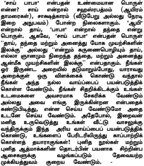 Сегодня мы прощаемся с текущим годом и готовимся встретить Новый год! Между ними существует тесная взаимосвязь. Точно так же, как мы прощаемся со старым годом и встречаем новый год, не должны ли мы проститься со всеми плохими качествами и развивать Хорошие и Божественные качества? Вы можете предложить все свои плохие качества Богу. В этом нет ничего плохого. На самом деле только Бог может принять их и пролить на вас Свою Милость, помогающую вам развивать Хорошие Качества. Например, предположим, что у вас есть запачканная и порванная банкнота, которую никто у вас не принимает. Но если на ней сохранился её серийный номер, то банк примет её и даст вам взамен новую купюру того же номинала. Подобным образом, только Бог может принять и примет плохие качества, при условии, что они предлагаются Ему с Искренней Преданностью и Покаянием, а взамен Он обильно одарит вас Своей Милостью.