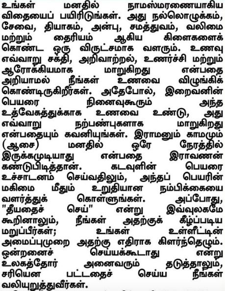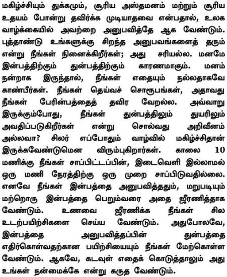 Agora estamos nos despedindo do ano atual e dando boas-vindas a um ano novo! Existe uma estreita relação entre os dois. Disparamos um enquanto recebemos o outro. Da mesma forma, não devemos dizer adeus às nossas más qualidades e dar boas-vindas às boas e divinas qualidades? Eles podem oferecer todas as suas más qualidades a Deus. Não há nada errado com isso. De fato, somente Deus pode tomá-los e conceder-lhes Sua graça para cultivar boas qualidades. Por exemplo, suponha que você tenha uma conta de cem rupias suja, quebrada e mutilada; Ninguém vai aceitar. No entanto, se o número estiver intacto, o Banco Central da Índia o aceitará e, em troca, receberá um bom ingresso do mesmo valor. Da mesma forma, somente Deus pode aceitar e aceitar más qualidades, desde que sejam oferecidas com sincera devoção e arrependimento e, em troca, Ele derramará Sua abundante Graça sobre você!